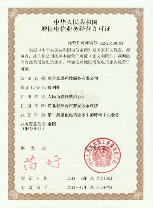 2013年8月23日 眾聯(lián)科技正式取得由國家工信部頒發(fā)的《中華人民共和國增值電信業(yè)務經(jīng)營許可證》。