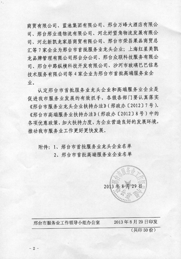 2013年9月 我公司被認定為邢臺市首批高端服務業(yè)企業(yè)
