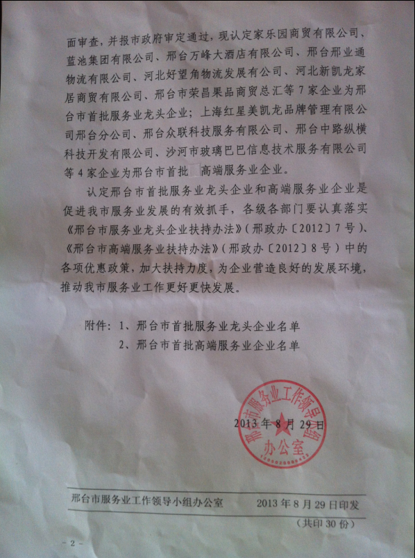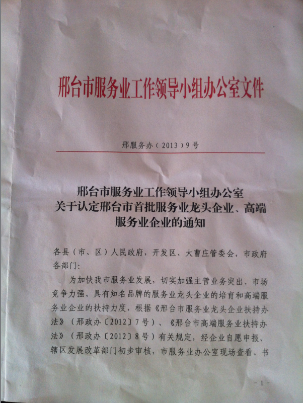 2013年9月23日,我公司接收由邢臺市服務(wù)業(yè)工作領(lǐng)導(dǎo)小組辦公室發(fā)布的《關(guān)于認定邢臺市首批服務(wù)業(yè)龍頭企業(yè)、高端服務(wù)業(yè)企業(yè)的通知》,通知中公布了邢臺市認定的7家首批服務(wù)業(yè)龍頭企業(yè)和4家高端服務(wù)業(yè)企業(yè)的名單,眾聯(lián)科技成功被認定為首批高端服務(wù)業(yè)企業(yè)。高端服務(wù)業(yè)企業(yè)的資格使得眾聯(lián)科技今后的發(fā)展道路更加平穩(wěn),政府部門會繼續(xù)加大扶持力度,給予各項優(yōu)惠政策,為公司創(chuàng)造良好的發(fā)展環(huán)境。